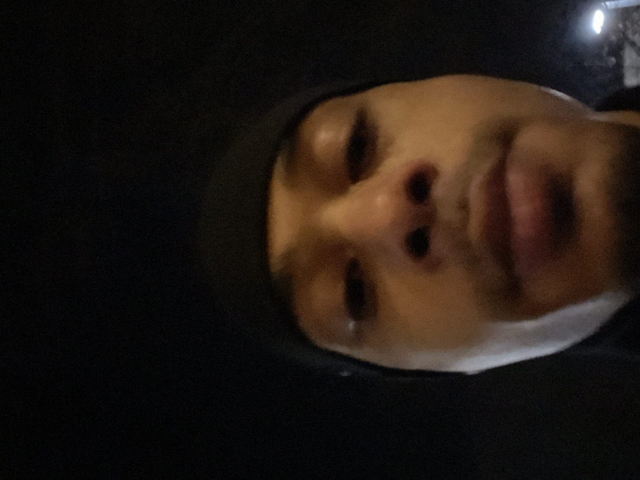 A close-up, low-angle view of a person's face against a dark background. The individual has a tanned complexion, and their eyes are visible but appear unfocused. The nose and lips are clearly defined. A white object, possibly a collar or scarf, is visible near the bottom of the frame. The lighting suggests an indoor or nighttime setting, as the face seems illuminated from above, creating soft shadows.