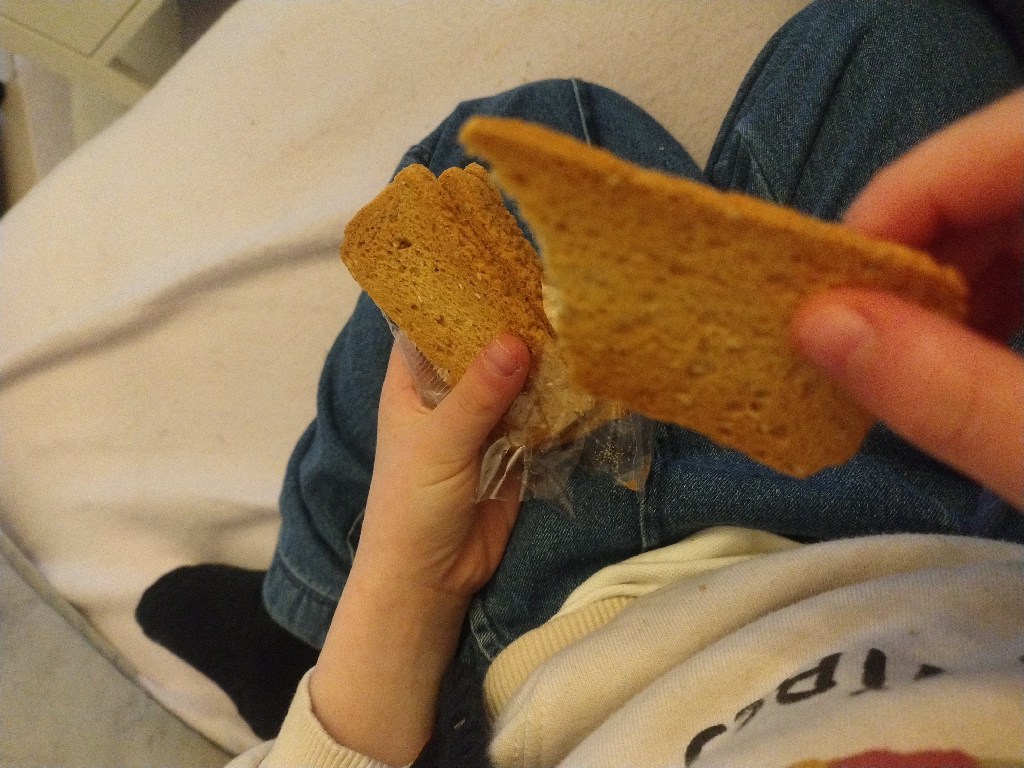 A close-up, downward-angled photograph depicts a person holding food items in their lap, situated in Crauthem, Luxembourg. The person is wearing blue denim jeans and a white long-sleeved garment with a ribbed cuff on the left arm. A black sock covers the visible left foot, which rests on a light-colored, soft textile surface, likely a blanket or duvet. The person's left hand grasps a transparent, crinkled plastic wrapper containing a stack of multiple rectangular, light-brown, dry toasted bread slices, consistent with rusks or zwieback. The right hand, positioned in the foreground and slightly out of focus, holds a single identical toasted bread slice. A portion of a white garment with a dark graphic or text is visible near the left hip. A blurred, light-colored object, possibly furniture, is faintly discernible in the upper right background.