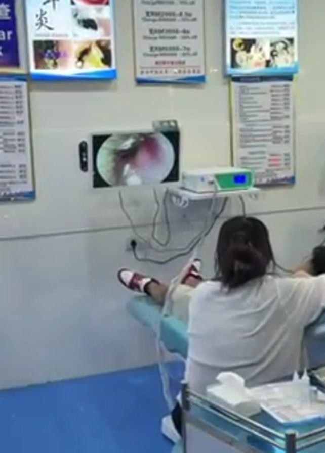 room with two patients receiving ear examinations. Each patient is lying on a blue examination chair with their head tilted to the side. A screen above each chair displays a magnified view inside the patient's ear. A woman in a white shirt is sitting near one of the chairs. On the wall behind them are informational posters with Chinese text, one of which mentions "Free ear check." A price of RM80 is also displayed on a sign. The floor is blue, and a silver cart with medical supplies is visible in the foreground.