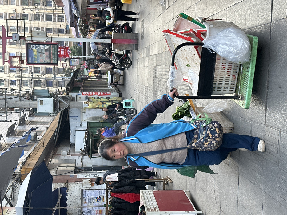 An outdoor street scene in Jiangjin, China, depicts a bustling commercial area. In the foreground, a middle-aged East Asian woman, dressed in a beige turtleneck, a blue and dark blue zip-up jacket, dark blue pants, and white sneakers, pushes a green-wheeled utility cart. She wears a patterned shoulder bag. The cart contains green leafy vegetables on a top tray, a white plastic basket with assorted contents resembling refuse or packaging, and a white plastic bag hanging from the side. The woman's gaze is directed towards the viewer. To her left, a clothing rack displays dark garments beneath a blue umbrella. Multiple signs are affixed to adjacent building walls, and overhead, a dense network of electrical wires and utility boxes is visible on poles. The paved sidewalk extends into the midground on the right, where several individuals are present. One person in a dark jacket stands with their back to the camera. Parked motorbikes and scooters are interspersed. Further down the street, a group of men are seated on stools near a building, one wearing a blue jacket. The background is dominated by a tall, multi-story residential building featuring numerous windows. The overhead space is dense with utility poles, electrical wiring, and various street signs bearing Chinese characters, including prominent red and white placards. The overall environment suggests an active urban market or commercial thoroughfare.
