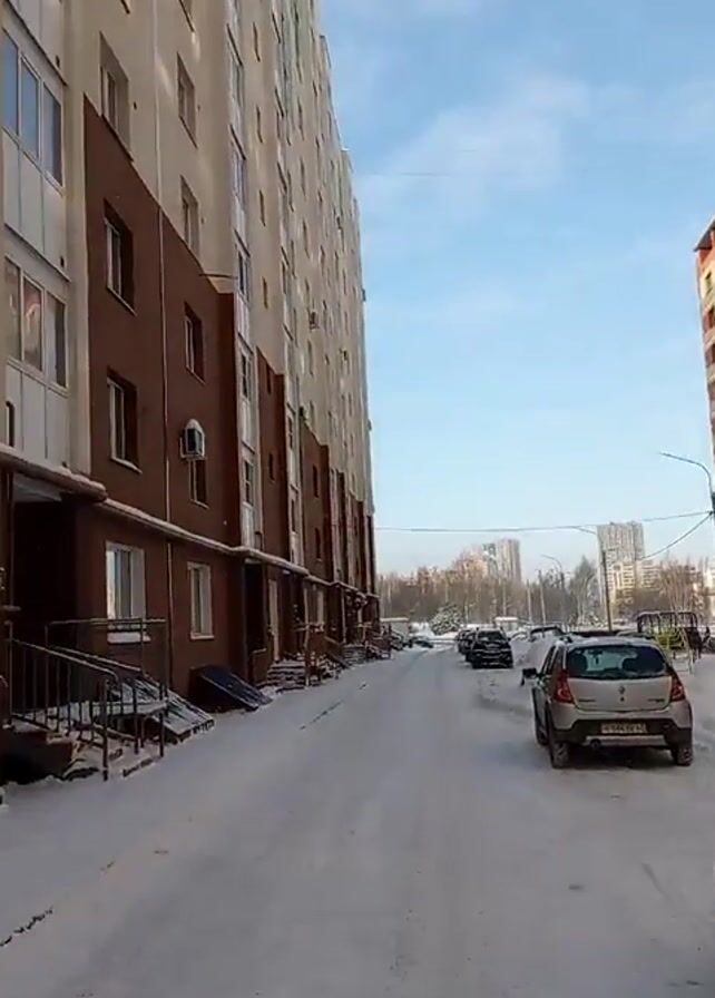 The camera pans across a snow-covered street lined with tall apartment buildings