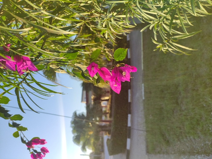 Pink bougainvillea flowers bloom near a street on a sunny day. The flowers are the focal point, with green leaves and foliage framing them. A road with white markers runs alongside a grassy area. The background includes a glimpse of buildings and trees under a bright, blue sky. The sun's rays create highlights and shadows, giving depth to the scene.
