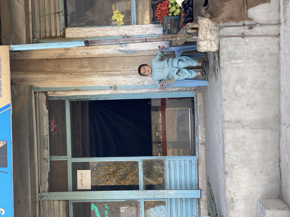 A young child, approximately 2-4 years old, is seated centrally on a light blue plastic chair on a raised concrete step in front of a storefront in Gul Kalachah, Afghanistan