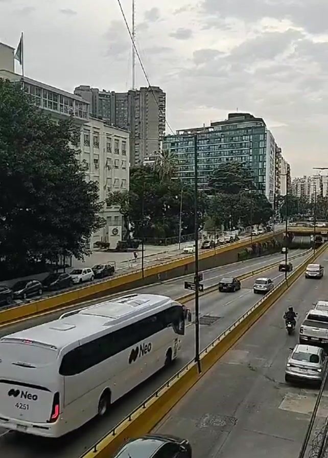 The video presents a mid-level angle view of a multi-lane urban expressway, likely in a bustling city, under overcast skies. A large white bus with the logo "Neo" travels on the leftmost lane. Other vehicles, including cars, buses, and a motorcycle, occupy the other lanes of the road. Buildings of varying heights and architectural styles flank the expressway, some adorned with visible windows and possibly balconies. A notable communication tower rises in the distance, piercing the cloud-filled sky. Trees dot the landscape, adding patches of greenery to the urban setting. The expressway is divided by a yellow-painted barrier, separating traffic flows. Sidewalks are visible on either side of the expressway, and a few pedestrians can be seen walking. The camera appears to be positioned on an overpass or elevated structure overlooking the road.