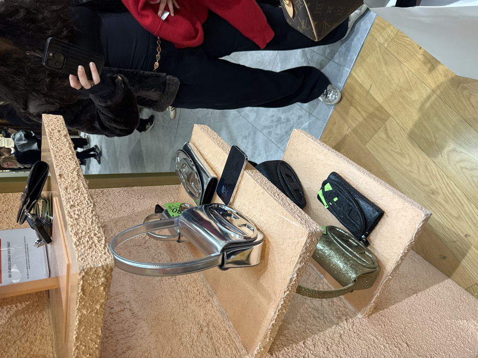 Several handbags are displayed on tiered, textured platforms. A silver metallic bag with a circular handle is in the foreground. Behind it are other bags in black, silver, and green. A black smartphone leans against one of the bags. A person in black pants, a red sweater, and a brown purse stands in the background, holding a black smartphone. A wooden floor and grey tiles are visible in the background.