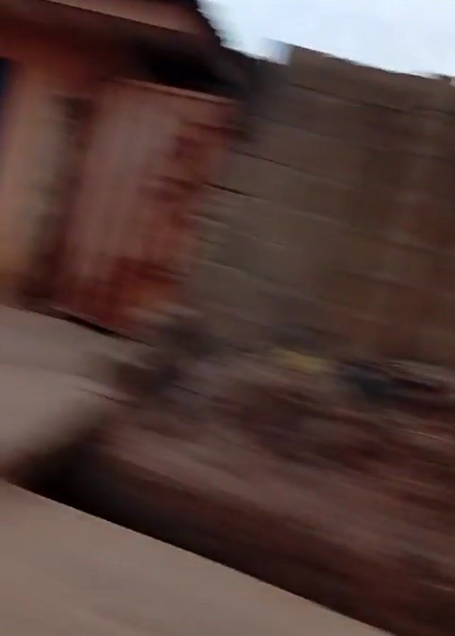 The video appears to be taken from a moving vehicle, possibly a car, as it drives along a street. The focus is on the buildings and structures that line the road. The buildings are a mix of simple designs and colors, including peach and green. The camera movement is fast and somewhat unsteady due to the motion of the vehicle. Overall, the scene is a quick glimpse of a residential or urban area as the vehicle passes through it.