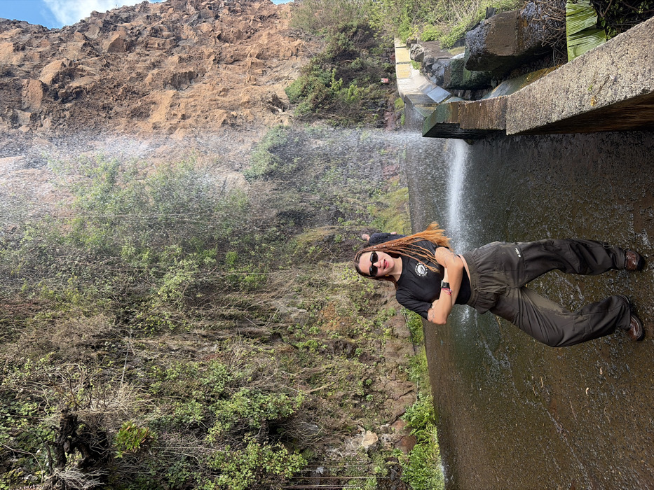 A female individual stands on a wet, paved road at the Cascata dos Anjos (Angels Waterfall) in Ponta do Sol, Portugal