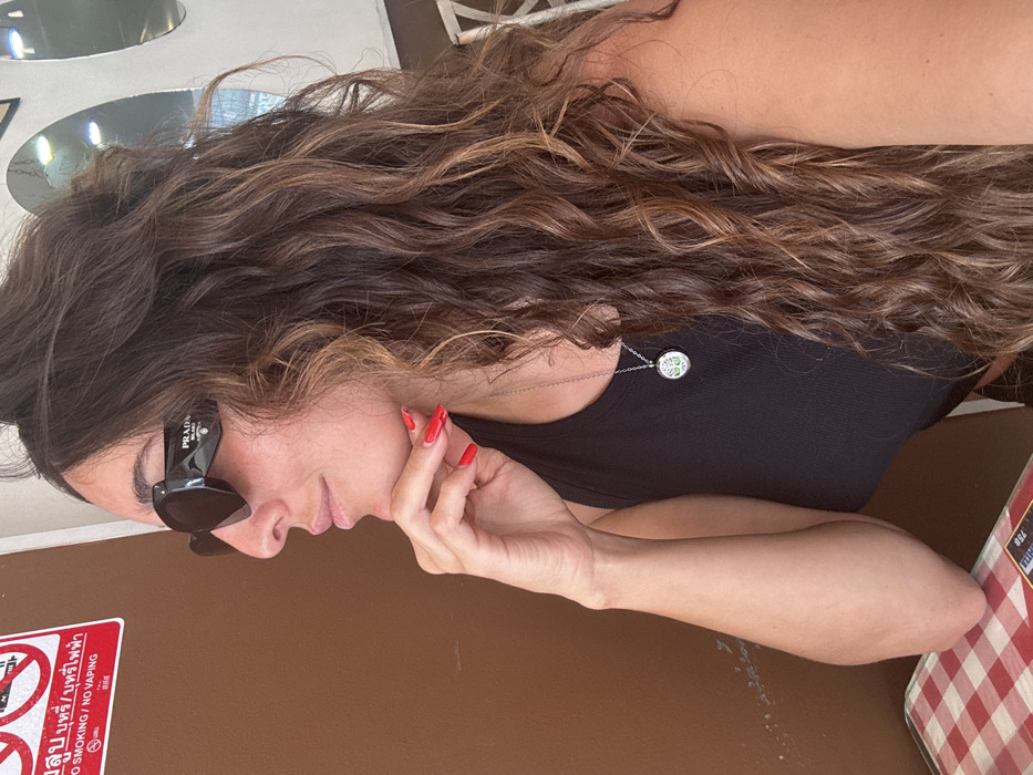 A female individual is seated indoors at a dining establishment in Thong Sala, Thailand, observed in a right-profile view from the chest up. She possesses long, wavy, dark brown hair with lighter brown highlights. The individual is wearing black, cat-eye style sunglasses with "PRADA" branding visible on the left temple. She is dressed in a black ribbed tank top and wears a silver necklace with a round pendant featuring a green and white 'tree of life' motif. Her right hand is positioned beneath her chin, with fingers slightly curled, displaying red nail polish. Her right elbow rests on a table covered with a red and white checkered tablecloth, where a menu or similar item is partially visible. Behind her, a brown wall features a red and white "NO SMOKING / NO VAPING" sign, with the text in both Thai ("ห้ามสูบบุหรี่ / บุหรี่ไฟฟ้า") and English. Reflections of overhead lighting or decor are visible in the background, suggesting an interior space.