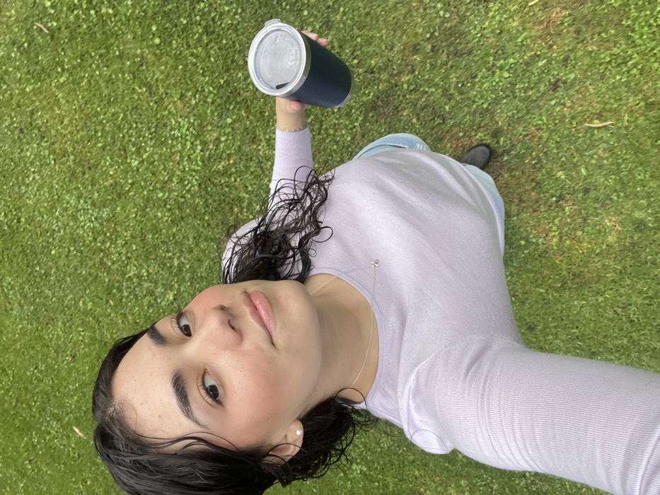 A high-angle photograph captures a young adult female standing outdoors on green grass. She possesses dark, wet, shoulder-length curly hair and a fair complexion. Her attire consists of a light purple long-sleeved top, light blue denim pants, and dark footwear. Accessories include a white pearl stud earring in her left ear and a thin silver chain necklace with a small, light-colored pendant. She holds a dark blue cylindrical thermal tumbler with a translucent lid in her right hand. Her gaze is directed towards the camera. The background consists entirely of green grass, appearing uniform and potentially damp. This scene is located in Huasca de Ocampo, Mexico.