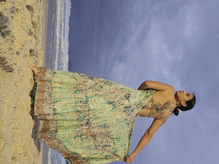 A woman stands barefoot on a sandy beach in Rio de Janeiro, Brazil, positioned with her back partially to the viewer, gazing towards the ocean. She wears a long, flowing, backless halter dress featuring a green, blue, and gold paisley pattern with a reddish-brown patterned border. A prominent dark tattoo depicting a winged creature or design is visible on her upper back. Her dark hair is pulled back, and she has visible earrings. Her left hand is observed holding a section of her dress fabric. Behind her, the ocean stretches under a dark, cloudy sky, with white-capped waves breaking near the shoreline. The environment consists of light-colored sand in the foreground and a turbulent sea meeting the beach.