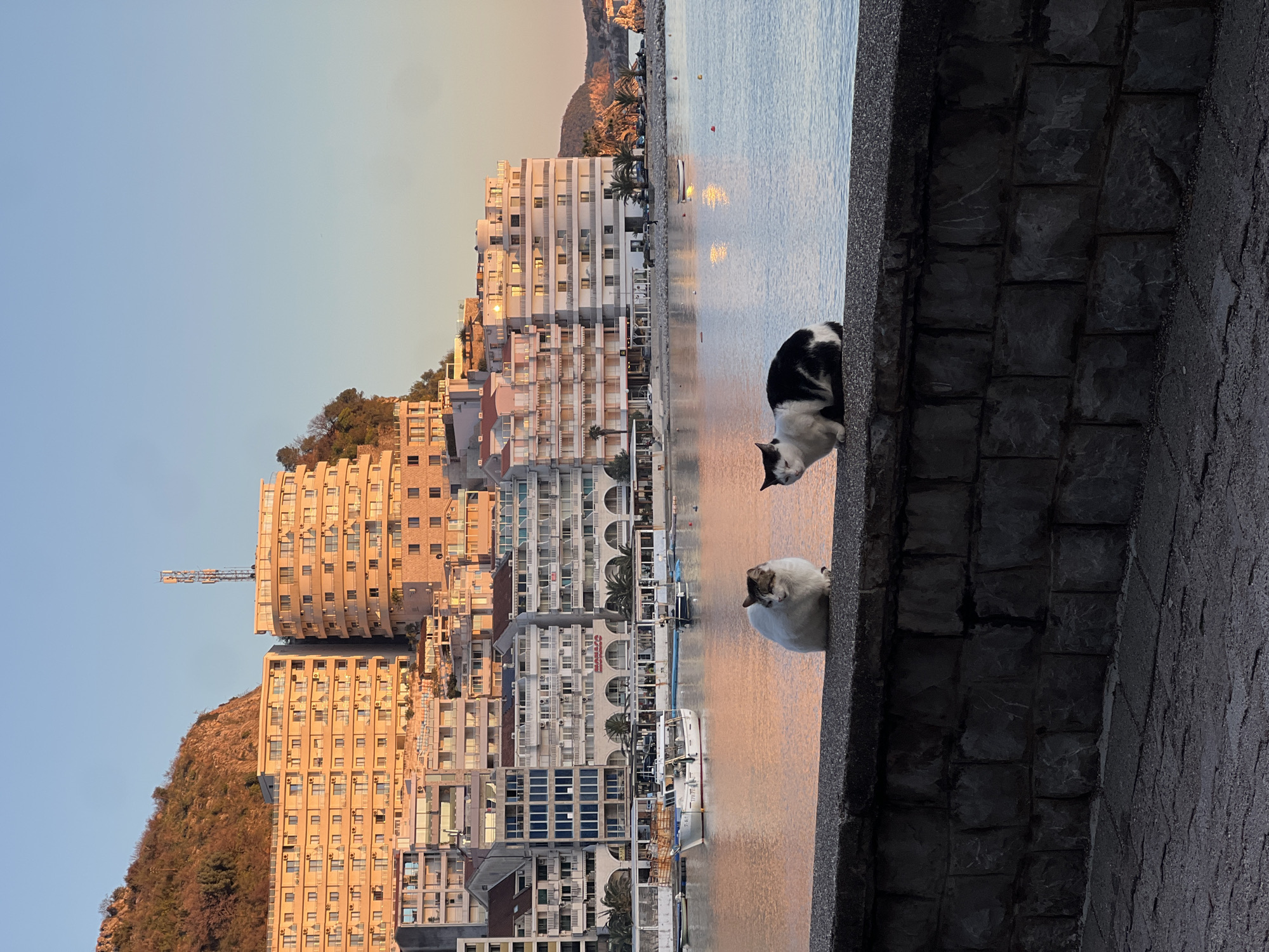 The image depicts a waterfront scene in Bečići, Montenegro, taken from an elevated position, possibly a walkway or wall. Two cats are in the foreground, resting on the edge of the wall overlooking the water. One cat is black and white, the other white and tan. The water is calm, reflecting the soft light of the setting or rising sun. In the background, a dense cluster of buildings dominates the landscape. The architecture includes modern apartments with balconies and rounded features, stacked together on a hillside. A tower crane can be seen. A beach is visible in the distance between the buildings and the waterfront. The sky is clear, with a gradient of light blue to orange-pink at the horizon.