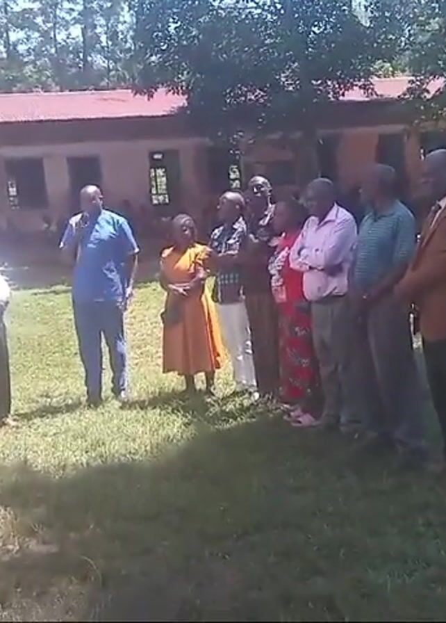 Okay, here’s a description of the video: The video shows a group of people standing in a grassy area in front of a building. The building appears to be a school, with a red roof and several windows. In the background, there is a larger group of people seated on benches. In the foreground, a man in a blue shirt and jeans is speaking into a microphone. There are seven other people standing next to him, listening. The group consists of both men and women. To the left of the speaker, there is a man in a white shirt and dark pants standing with his hands crossed. To the left of that man, there is a tent. To the right, a man in a brown blazer is standing with his hands crossed. The setting appears to be outdoors, with trees visible in the background. The weather looks sunny. The speaker is making a speech in front of an audience of seated students. The audience cheers after his remarks.
