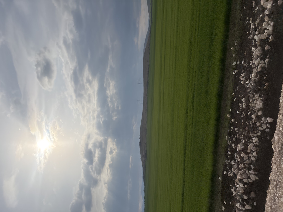 The image depicts an agricultural landscape within Ognianovo, Bulgaria. The immediate foreground features a dark soil embankment sparsely covered by uniform green vegetation, with numerous irregular, light-colored rocks scattered across its surface. Beyond this, a vast, cultivated field of vibrant green crops extends across the midground, displaying subtle parallel lines consistent with agricultural tilling. In the background, a range of rolling brown hills, sparsely vegetated, rises above the field. Three electricity transmission pylons are discernible atop these hills towards the right side of the frame. The sky occupies the upper half of the image, characterized by a mix of grey and white clouds. The sun is visible in the upper-left quadrant, partially obscured by clouds and emitting a bright, radiating light. No human subjects or discernible activities are present.