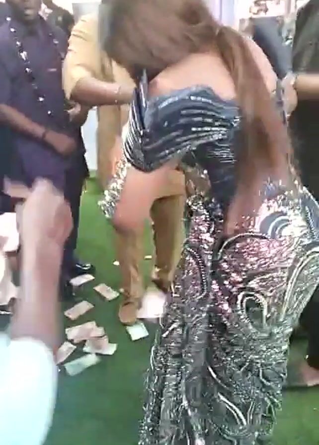 people in what appears to be a party setting. A woman in a sparkly outfit is seated and dancing as money is thrown around her. Several individuals are visible around her, some dressed in casual attire and others in more formal wear. The ground is covered with what seems to be artificial grass and scattered currency. The atmosphere looks festive and celebratory.