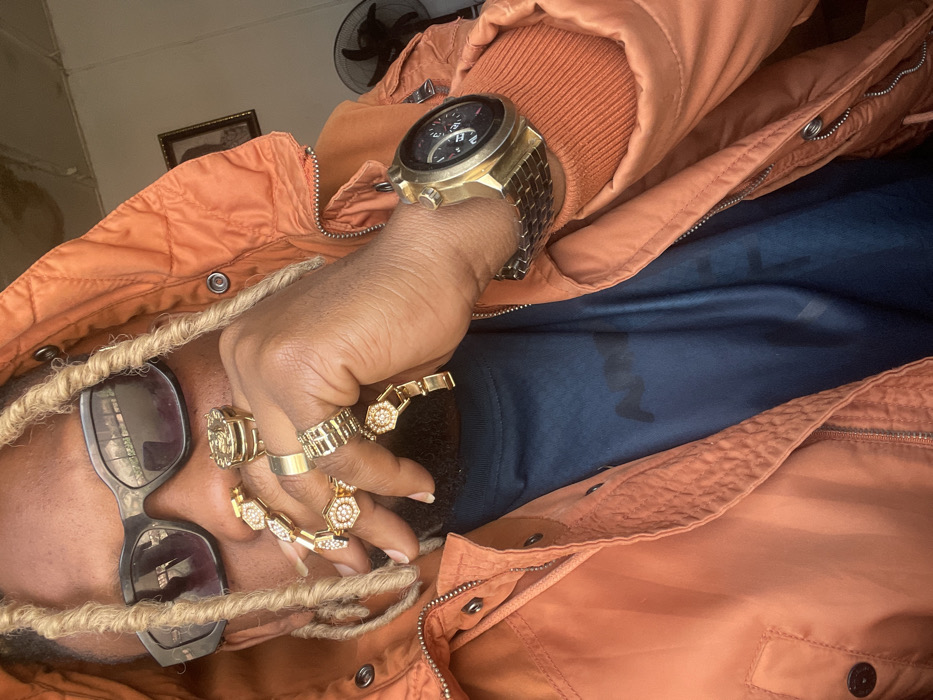 The image displays a close-up, chest-up portrait of an individual situated in Jos, Nigeria. The subject, a person with dark skin, visible facial hair, and blonde dreadlocks, wears dark rectangular sunglasses. Their left hand is raised towards their chin/mouth area. This hand is heavily adorned with gold-colored jewelry: a wide band on the index finger, a large ornate circular ring on the middle finger, and a combination of a hexagonal diamond-encrusted ring and a linked, similarly adorned bracelet-like piece wrapped around the ring finger. On the right wrist, a gold-colored wristwatch with a dark face and a metal link band is visible beneath the cuff of an orange, possibly quilted, hooded jacket. Underneath the jacket, a dark blue shirt with a faint, dark graphic is visible. The background consists of a plain, light-colored wall, with a dark-framed picture hanging on it to the subject's upper right, and a dark, stationary electric fan positioned further right. The scene is brightly lit.