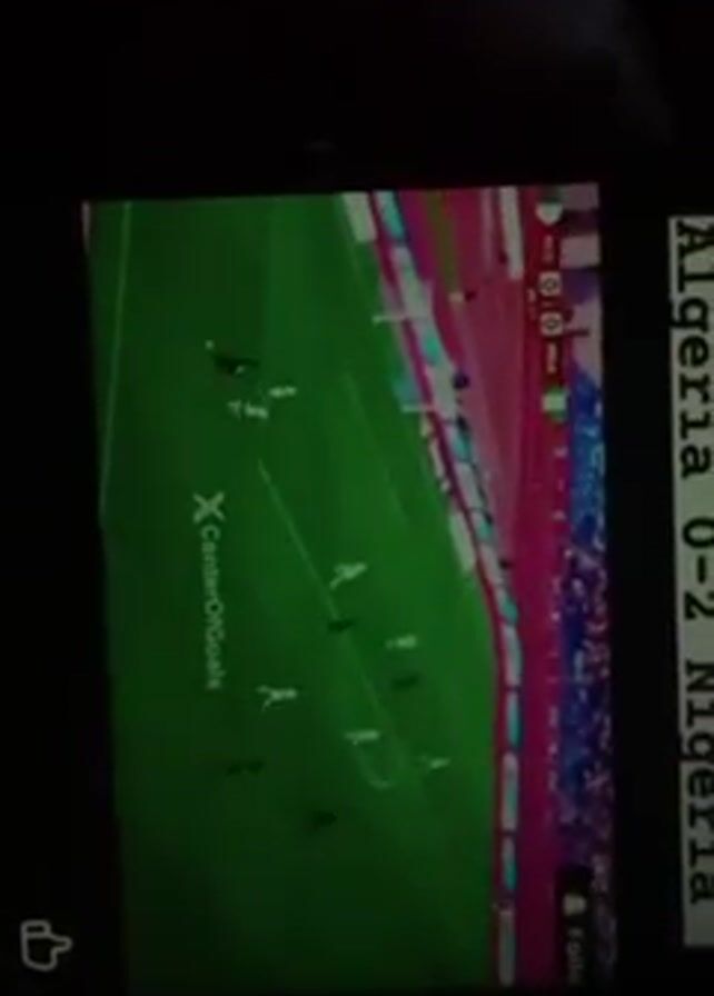 screen displaying a soccer match between Algeria and Nigeria. The score is Algeria 0, Nigeria 2. The game is being played on a green field, and there are players in white and green uniforms. The screen is being held by a hand, and the background is dark.