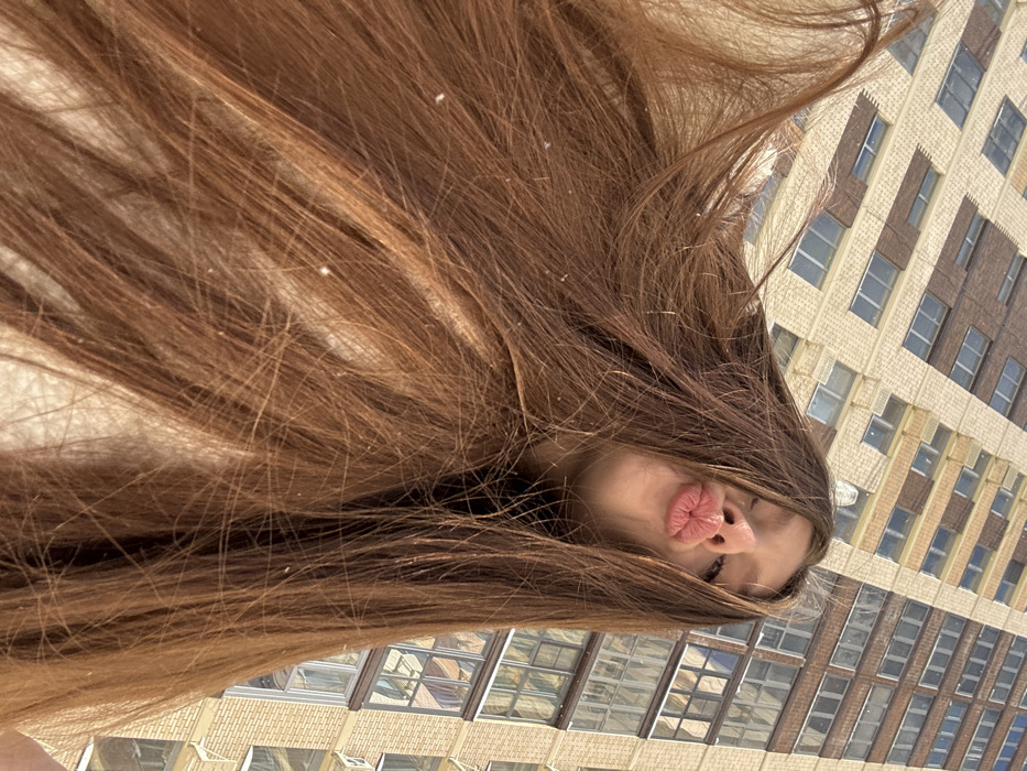 An outdoor, low-angle portrait features a young female subject in Balashikha, Russia. Her long, brown hair, appearing windswept, occupies the majority of the lower two-thirds of the frame. Small, distinct white flakes, indicative of snowflakes, are visible on her hair strands. Her head is tilted back, with her face angled towards the camera. Her lips are puckered into a "kissy face" expression, while her eyes are partially obscured by hair, with one eye (viewer's right) appearing slightly closed. The background consists of a tall, multi-story residential building with a light-colored facade and prominent brown horizontal banding, featuring numerous rectangular windows. The lighting suggests a bright, possibly sunny, winter day.