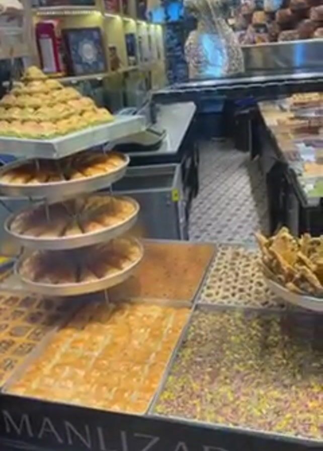 storefront display of Turkish baklava. Various types of baklava are presented on trays and tiered stands. The storefront is brightly lit, showcasing the golden and green hues of the pastries. The name "OSMANLIZADELER BAKLAVA" is visible on the front of the display, indicating the shop's name and specialty. Through the glass windows behind the display, a street scene with people and outdoor seating can be seen.