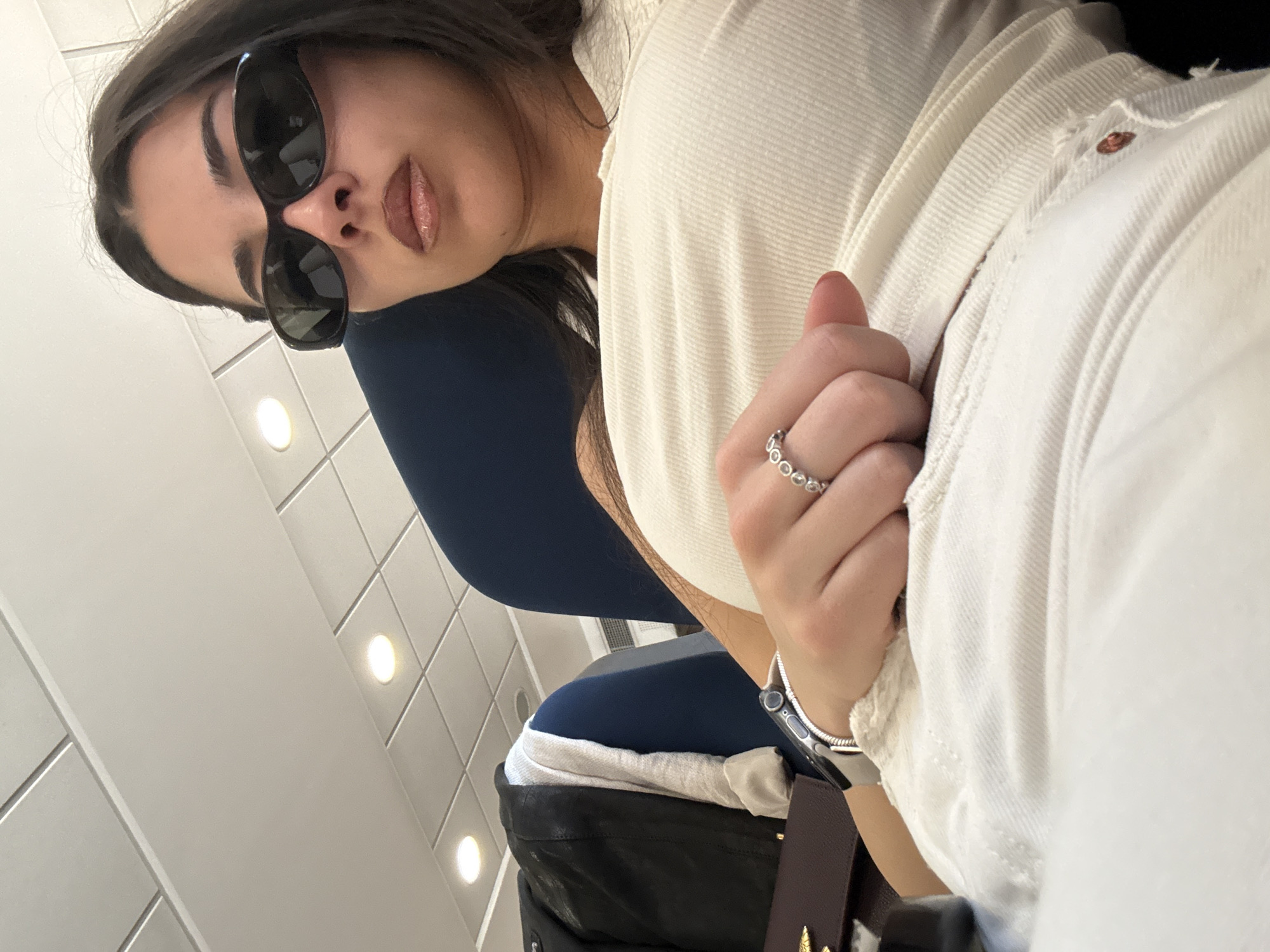 A selfie of a woman wearing sunglasses, a white shirt, and a ring, taken on a plane