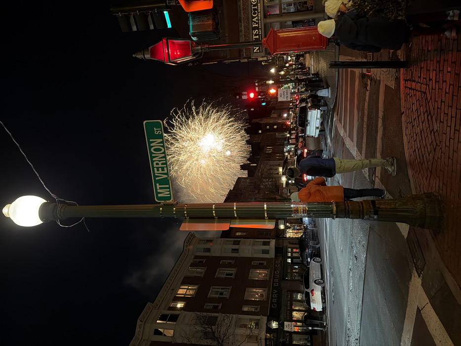 A street corner at night features fireworks in the sky above buildings and onlookers. A street sign reads "Mt Vernon St." A vintage lamppost stands on the corner. A building is labeled "Gary Drug Co." A red mailbox and a sign saying "NTS Factory" are also visible. People stand on the sidewalk watching the fireworks display. Traffic lights and parked cars fill the street scene.