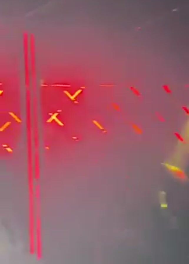 interior of a crowded nightclub or event venue. The space is filled with fog and illuminated by colorful lights, including red, yellow, green, and purple. People are visible in the background, mostly as silhouettes due to the lighting conditions. There is also a illuminated design, likely a logo, visible on the back wall.