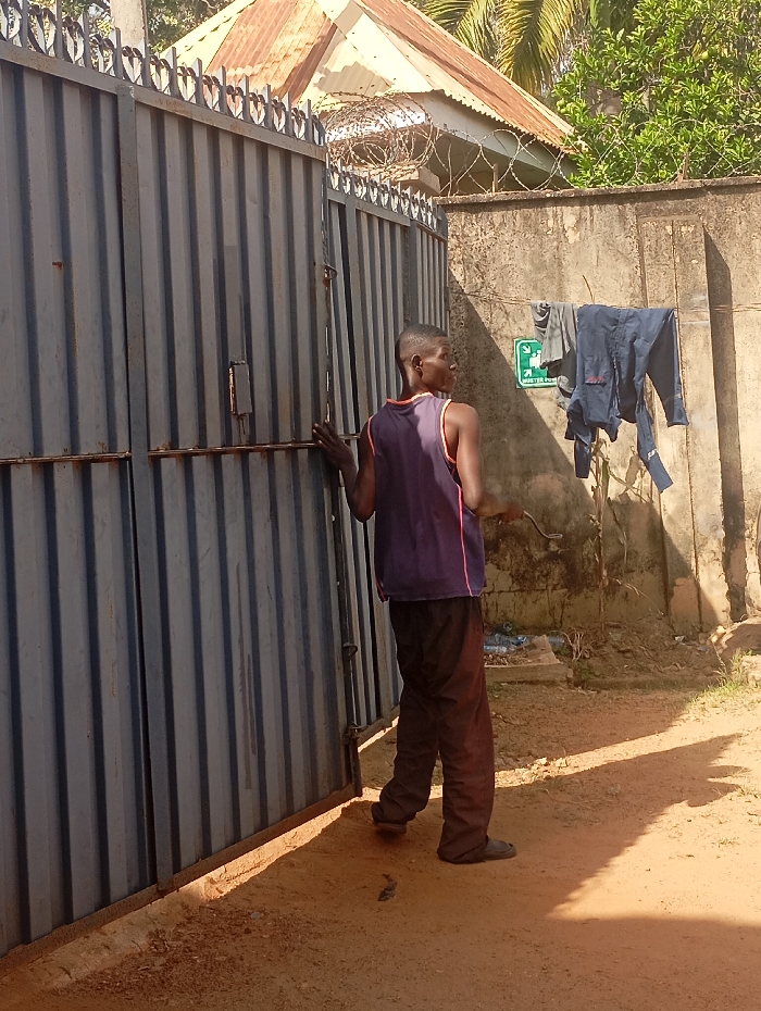 An outdoor scene in Jos, Nigeria, depicts a dark-skinned male standing in front of a large, dark grey corrugated metal double gate, appearing to operate it with his right hand on the gate's edge