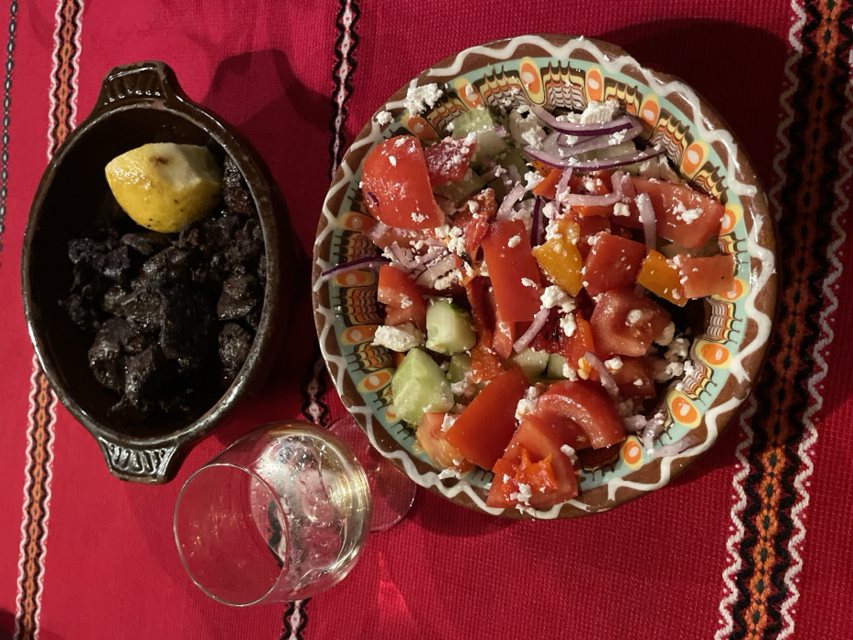 The image displays a dining setting indoors, located in Berlin, Germany. A red tablecloth featuring a repeating white, orange, and black woven pattern serves as the surface. Centered at the top, a dark brown ceramic bowl with two small handles contains an indeterminate dark, cooked food item, possibly meat, alongside a single yellow lemon wedge. To the left, a partially filled clear wine glass holds a light-colored liquid, consistent with white wine, and exhibits condensation on its surface. Dominating the lower portion of the frame is a round ceramic plate with a decorative border in shades of brown, white, orange, and green. This plate holds a salad composed of diced red tomatoes, sliced green cucumbers, thinly sliced red onions, and crumbled white cheese. The scene is illuminated by warm, possibly artificial, indoor lighting. No individuals are visible in the frame.