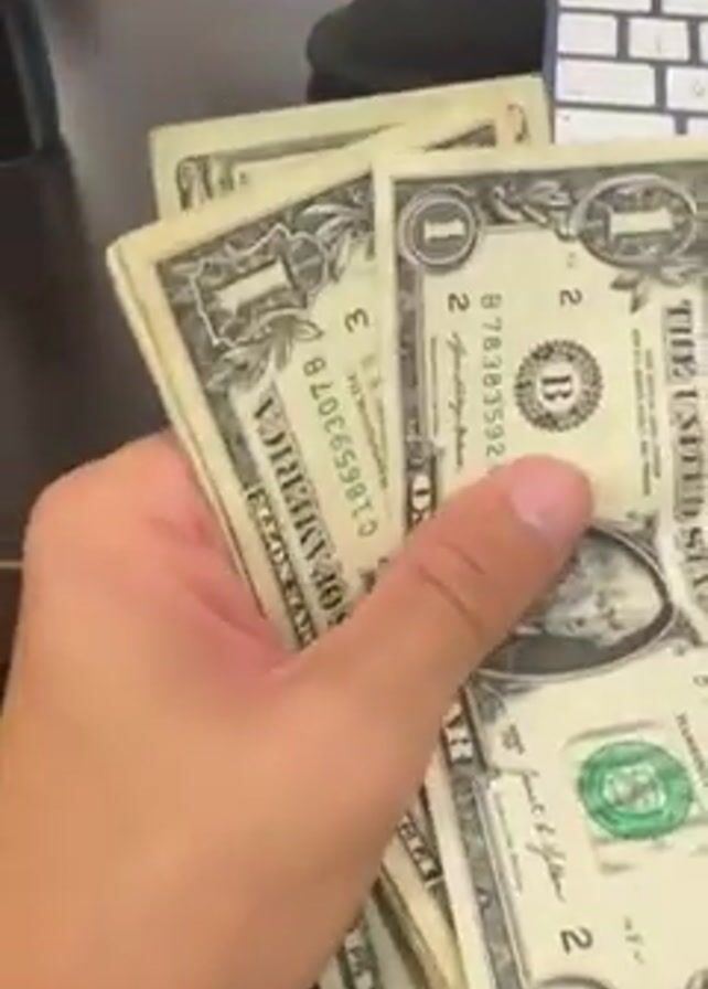 A person is holding a stack of US dollar bills, mostly one-dollar bills and some twenty-dollar bills. The person is arranging the bills, which are on a dark brown table surface. A white computer keyboard and a pack of cigarettes are visible in the background. The environment appears to be an office or workspace.