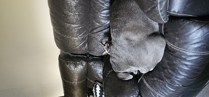 The scene depicts an interior setting in Esch-sur-Alzette, Luxembourg. A dark, multi-sectional couch, appearing to be constructed of worn leather or a similar material with visible light scuffs and white contrast stitching, occupies the majority of the frame. Positioned on the couch is a large, short-haired gray animal, identified as a dog, lying with its back oriented towards the viewer. Its body covers a significant portion of the central and lower cushions. Partially visible behind the dog's back, a cat's head with dark fur, alert eyes, and pointed ears is observed peering over the larger animal, facing the camera. A black and white geometric patterned throw pillow is partially visible on the left side of the couch. The background consists of a plain, light-colored wall.