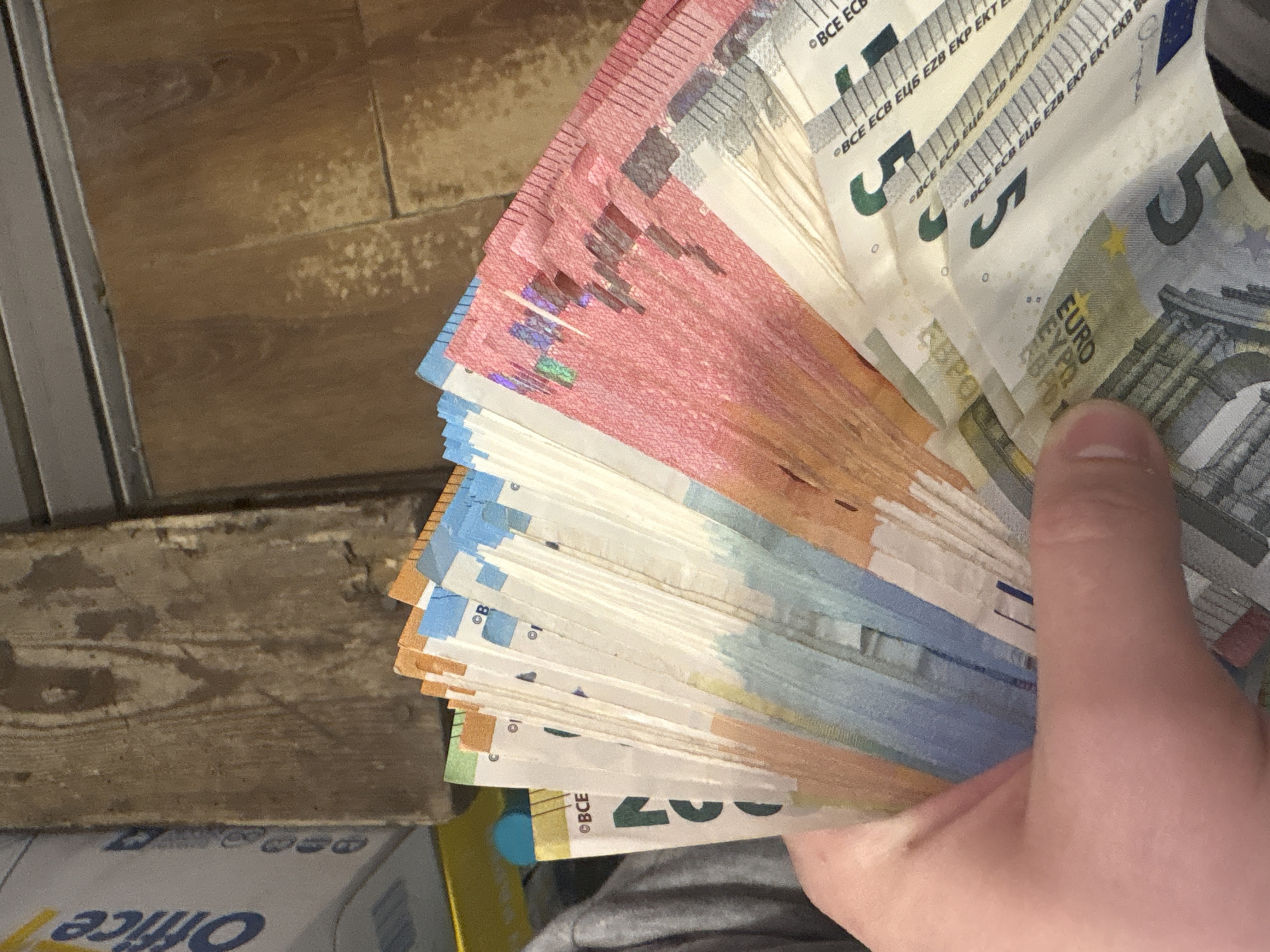 A close-up, angled photograph depicts a human hand holding and fanning out a substantial quantity of Euro banknotes in an indoor setting. The hand, exhibiting fair skin tone, is positioned in the lower-left portion of the frame, displaying various denominations of Euro currency, including visible 5 Euro (green/grey), 10 Euro (red), 20 Euro (blue), 50 Euro (orange), and 100 Euro (green) notes, identifiable by their distinct colors and "BCE ECB" markings. The background features a distressed, light brown wooden surface in the upper central area. To the upper left, a white box with partial blue text indicating "Office" is visible, alongside a yellow object. The lower-right background shows a light brown wooden floor or table surface with visible grain and areas of wear. A dark grey or metallic strip runs horizontally across the top edge of the frame. The specific location within Goce Delcev, Bulgaria, cannot be determined from the visual information provided.