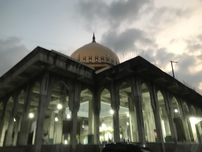 The image displays the exterior of a large mosque, identified as being in Bireuen, Indonesia, observed during twilight conditions (dusk or dawn)