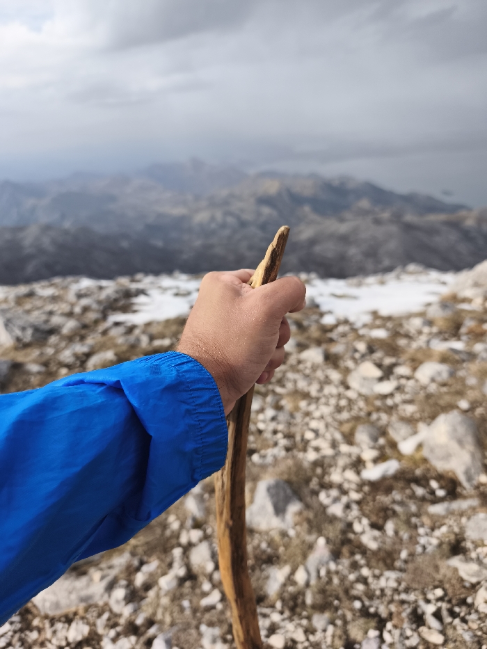 The image displays a first-person perspective from a high-altitude, rugged mountain environment in Mali Mikulići, Montenegro. In the foreground, a human right arm, wearing a bright royal blue long-sleeved jacket with an elasticized cuff, holds a natural, gnarled light-brown wooden stick vertically. The midground consists of an uneven, rocky terrain covered with light-colored stones, sparse dry vegetation, and scattered patches of white snow. The background reveals a vast landscape of multiple hazy, grey mountain ranges receding into the distance, all beneath a heavily overcast, diffuse grey sky.