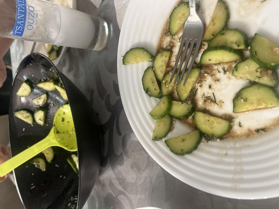The scene depicts an indoor dining environment, likely in Varna, Bulgaria, although no specific Varna landmarks are discernible. A light-grey tablecloth with a repeating dark, swirling ornamental pattern covers the table surface. In the foreground, a white ceramic plate, featuring concentric raised ridges, holds approximately eighteen crescent-shaped cucumber slices. These slices are coated in a brownish liquid, interspersed with white sesame seeds and green herbaceous flecks. A silver metal fork with four tines rests horizontally across the center of the plate, partially covered by cucumber slices. In the midground, to the upper left, a black, glossy serving bowl contains residual cucumber slices, sesame seeds, and herbs, along with a bright neon yellow plastic serving spoon. To the upper right, a tall, clear glass bottle with a blue label, distinctly marked "TSANTALI OUZO" and "Since 1890," stands partially filled with a cloudy white liquid. Portions of human hands and arms are visible in the background, indicating the presence of at least two individuals at the table, engaged in a meal. One hand is positioned near the ouzo bottle, and the upper-left corner of the image shows a blurred portion of a person's head. The scene portrays an active meal.