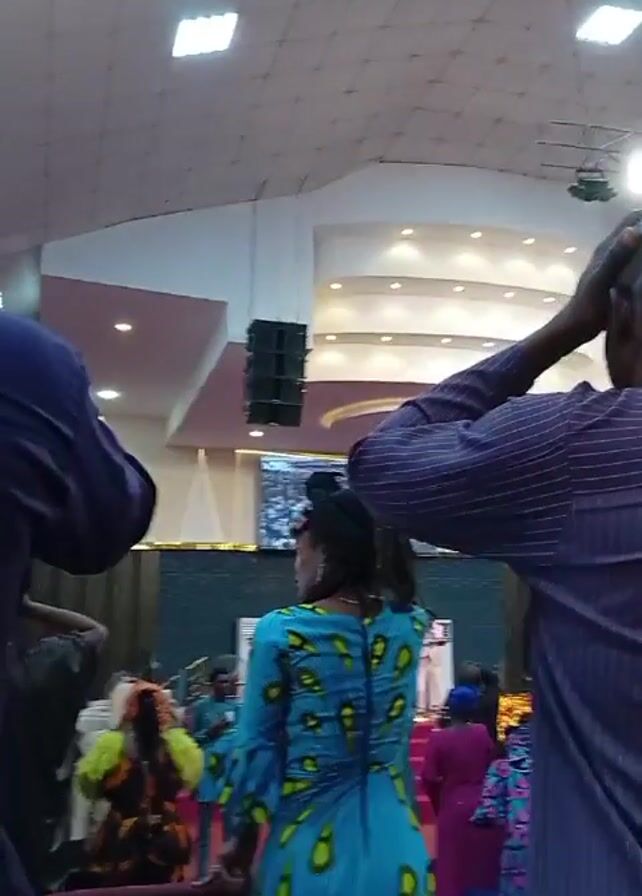 several people gathered in what appears to be a church or large hall. The people are dressed in colorful, patterned clothing, and some are raising their hands in the air. The camera focuses on the backs of the people in the foreground, while others can be seen in the background. Overhead lighting illuminates the scene, and there are large speakers hanging from the ceiling. The people seem to be engaged in a worship or prayer service.
