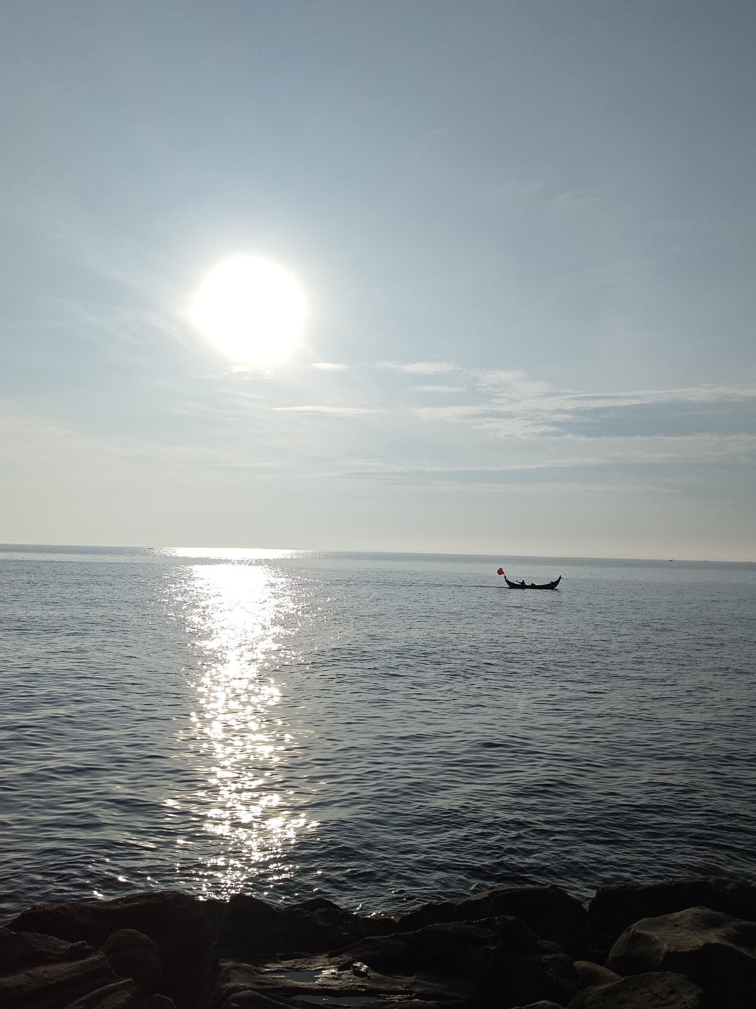 The image depicts a coastal scene in Lhokseumawe, Indonesia. The sun is high in the sky, reflecting brightly on the ocean surface. A small boat with a red flag is visible in the distance. Rocks are visible in the foreground.