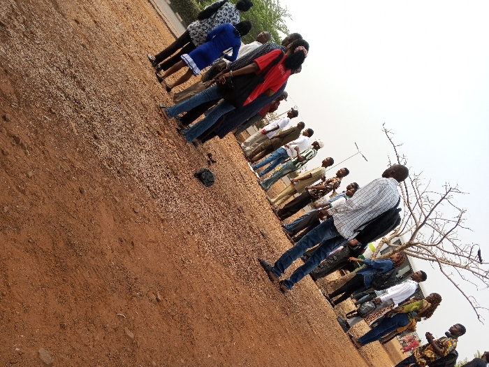 The image depicts an outdoor gathering of approximately twenty-five to thirty individuals on an unpaved, reddish-brown dirt and gravel ground, likely within the city of Minna, Nigeria
