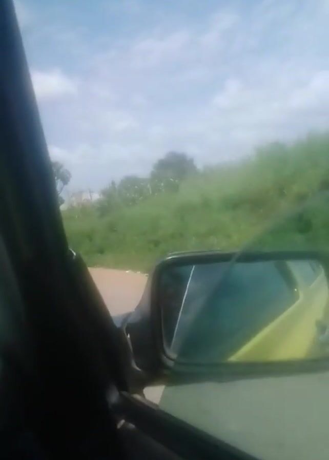 view from inside a car moving on a road with green vegetation on the sides. The sky is visible with some clouds. A power pole stands on the right side of the road. The side mirror of the car is in view, reflecting a blurred image of the car's interior. A building is visible in the distance.