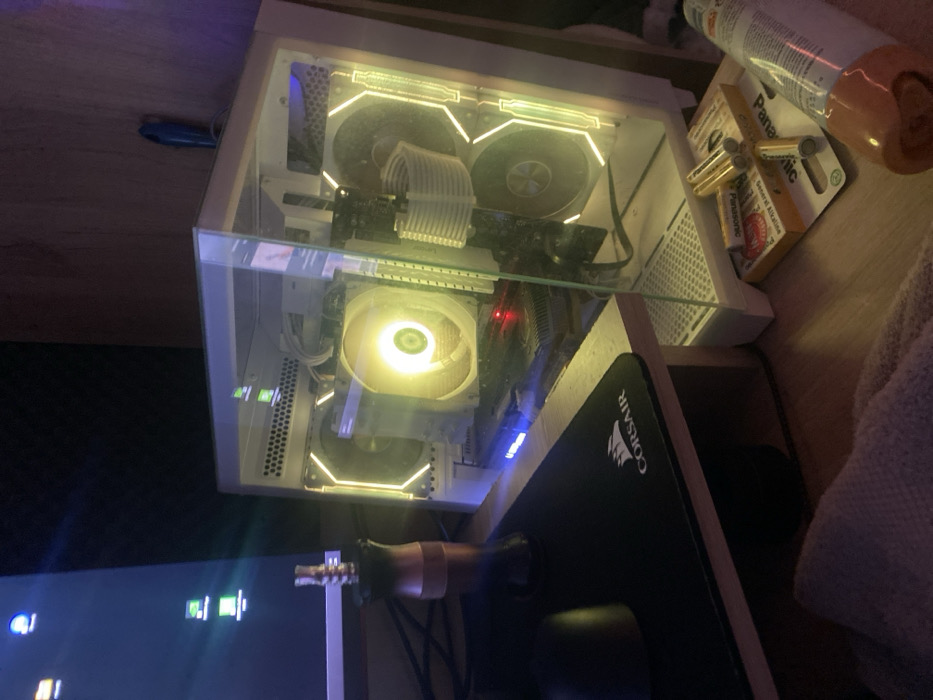 The image depicts an indoor scene focused on a computer desk setup in an unspecified room in Unknown, Unknown. The lighting is dim, primarily originating from the illuminated components of a personal computer. On the left, a dark monitor displays a desktop with at least two green square icons. A black computer mouse rests on a black mousepad with a white "CORSAIR" logo. Adjacent to the mouse, a two-toned dark and copper-colored object, resembling a hookah top or vape attachment, stands upright. The central focus is a white computer tower with a clear glass side panel, revealing internal components brightly lit with yellow/orange LEDs. A large circular CPU cooler fan glows prominently in the center, flanked by other case fans with LED rings. A graphics card, emitting a red LED light and featuring a blue illuminated strip, is visible at the bottom of the case, above a white-colored PSU shroud. White braided cables are neatly routed within the tower. A small blue object is perched on top of the computer tower. To the right of the computer tower, on the light-colored wooden desk surface, an opened package of "Panasonic General Alkaline" batteries is present, with three loose batteries lying on top of it. A white and orange spray can is partially visible to the right of the batteries. A light-colored, textured fabric, possibly a blanket, is visible in the lower foreground. The background behind the desk appears to be a light wooden wall. No individuals are present, and no active interactions are occurring.