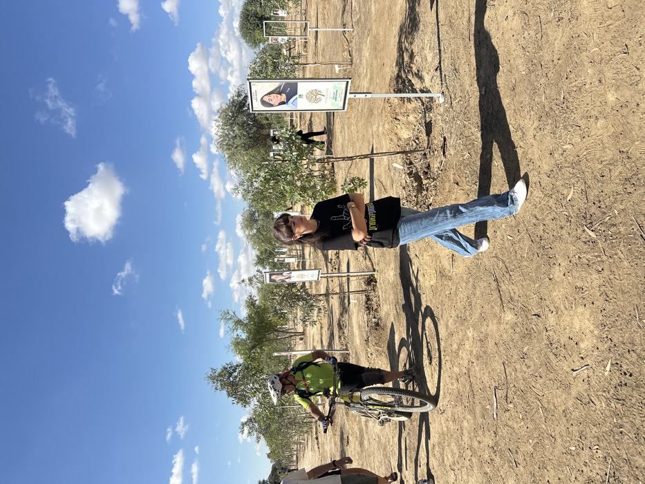 The image captures an outdoor memorial site, specifically identified as the 'Living Forest' in Kibbutz Re'im, located within the Eshkol Regional Council, Israel. The scene is set under a clear blue sky with scattered small white clouds. The ground is dry, light brown soil with sparse debris. In the foreground, a young woman with dark hair and dark sunglasses walks from right to left. She wears a black short-sleeved t-shirt featuring a graphic (including a "rock on" hand gesture and Hebrew text) and light blue wide-leg jeans with white flat shoes. Her arms are crossed in front of her. To her left, in the midground, a man wearing a bright green long-sleeved athletic shirt, dark shorts, a white and black bicycle helmet, and sunglasses, walks from left to right, pushing a yellow/lime green mountain bike. The lower legs of another person in light shorts and sneakers are partially visible to the man's left. A distant figure in dark clothing is also visible among the trees in the background. The landscape is characterized by numerous young, slender trees planted in rows. Interspersed among these trees are multiple vertical white memorial signs with black frames, mounted on silver posts. Each sign displays a color portrait of an individual, along with Hebrew text and a stylized tree graphic at the bottom. Shadows from the people, trees, and signs are cast upon the ground, indicating bright daylight conditions.