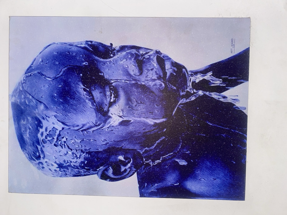 A blue-toned artwork portrays a person's face and neck in a semi-realistic style, evoking a sense of movement like water or liquid. The image has a granular texture with white speckles, adding depth. The person is depicted with their head tilted back, and the neck is visible. The artwork is labeled with "ART, HAZID" in the top right corner.