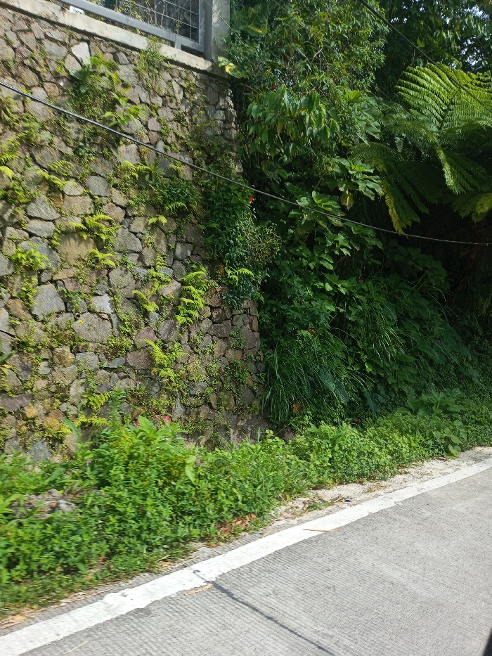 The image depicts a roadside scene in Kandenuwara, Sri Lanka. In the lower right, a gray asphalt or concrete road surface is visible, bordered on its left edge by a solid white line. Adjacent to the road, a narrow strip of low-lying green ground cover and weeds runs parallel. To the left, a weathered stone retaining wall rises vertically, constructed from varied gray and brown stones. Numerous green ferns and small plants are rooted in the crevices and cover portions of the wall's surface. Above the wall, a metal railing or fence is partially visible. Two dark utility wires span horizontally across the upper mid-section of the frame, passing in front of the wall and dense vegetation. To the right of the stone wall and extending upwards, a thick expanse of various green tropical vegetation, including large ferns and broad-leafed plants, covers an embankment. No individuals or animals are present in the scene.