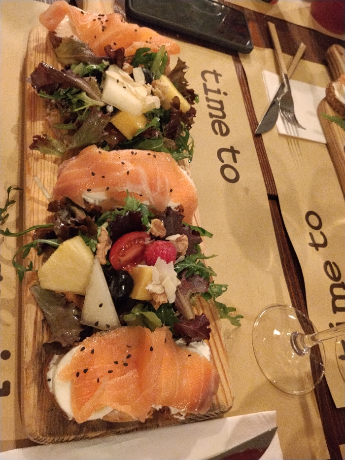 The image depicts a close-up view of a food platter arranged on a wooden board, presented on a table within a dining establishment in Braga, Portugal. The central subject is a light-colored wooden serving board holding three portions of food. The top and bottom portions consist of a base, likely bread, topped with a white spread, layered with thin slices of orange-pink smoked salmon, and sprinkled with black sesame seeds. The middle portion, and the areas between the salmon preparations, feature a mixed salad. Components visible in the salad include various greens (red and green lettuce, arugula), diced yellow fruit (consistent with pineapple or mango), slices of a pale, firm fruit (possibly pear), halved red cherry tomatoes, whole red raspberries, walnuts, black olives, and white shaved ingredients (possibly cheese or another firm item). The wooden board rests on a light brown paper placemat printed with the repeating phrase "time to" in dark brown lettering. To the right, another identical placemat displays a silver fork and a knife with wooden handles, placed on a folded white napkin. A clear wine glass is positioned in the bottom right foreground. A dark-colored smartphone lies face down in the upper background, partially visible on a dark surface, possibly a wooden table. No individuals are visible.