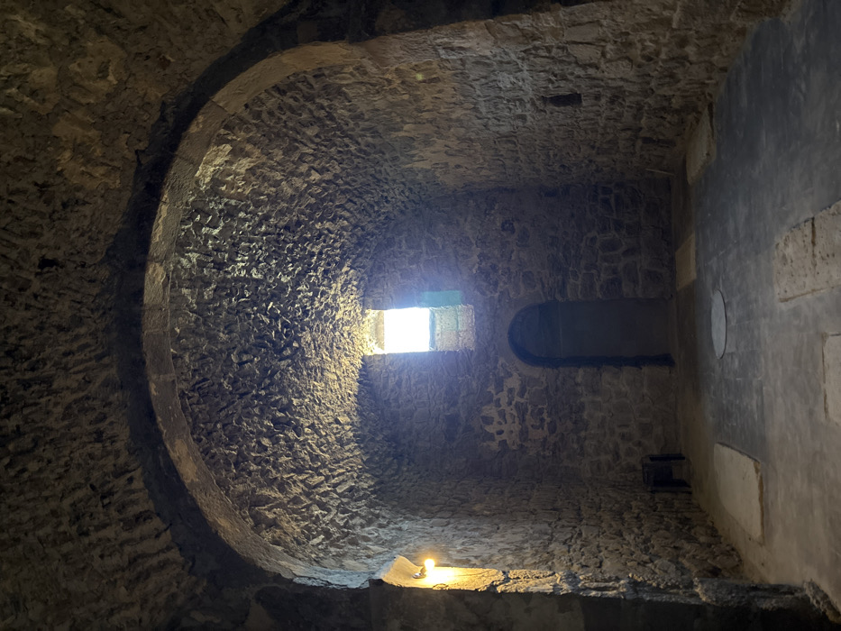 A dim, stone interior featuring an arched ceiling and walls constructed of rough-hewn stones. Sunlight streams in from a small window in the distance, illuminating the left side of the arched structure. A small light, possibly a candle, glows near the base of the arch. A narrower, arched window or recess is visible in the wall on the right. The overall atmosphere is ancient and enclosed.