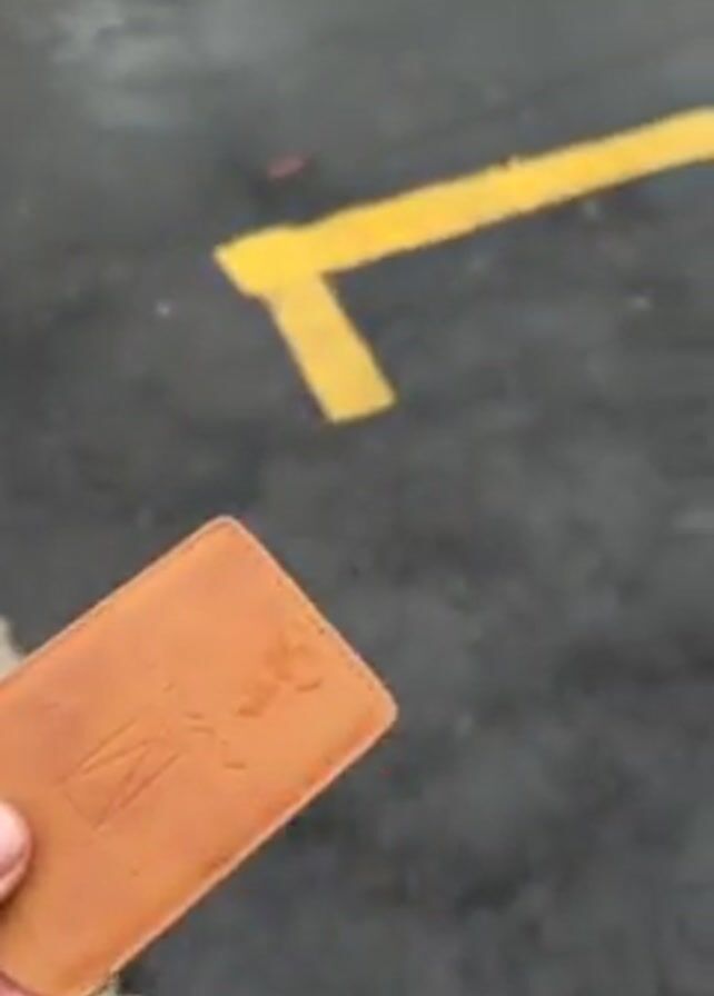 A person holds a small, brown leather card or case in their hand, showing it to the camera