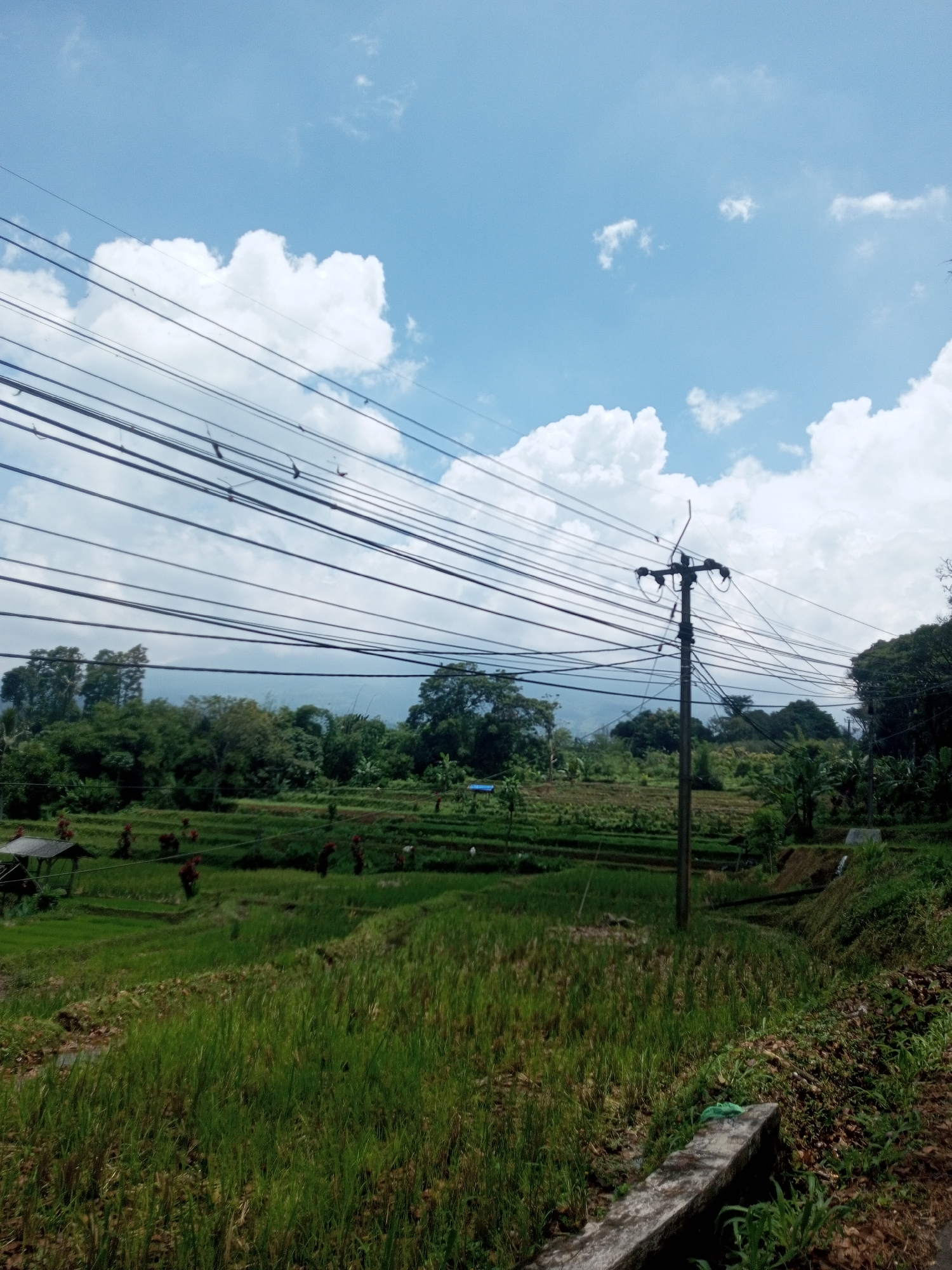 rural landscape with rice paddies in Kioumaknao 2, Laos. The rice paddies are lush green and terraced. People appear to be working in the fields. An overhead power line runs across the top of the frame, supported by a utility pole in the midground. The sky is blue with scattered white clouds. Trees and other vegetation form the background. A concrete barrier is visible in the foreground.