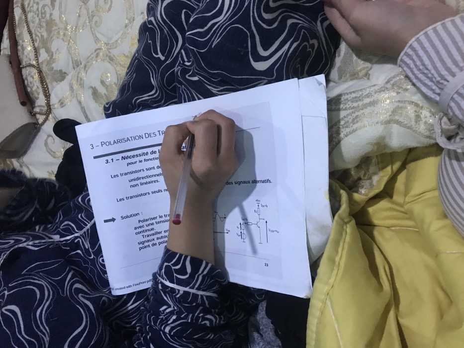 This image depicts an indoor scene in Ouislane, Morocco, captured from an elevated perspective. The primary subject is a person's right hand, holding a clear plastic pen with a red tip, actively writing or marking on a white paper document. The document displays technical content in French, including the heading "3 - POLARISATION DES TR" and a section "3.1 - Nécessité de la polarisation des transistors" with descriptive text and a circuit diagram illustrating a transistor. The individual's arm is clad in a dark blue garment patterned with white abstract swirls. A second person's left hand, wearing a light-colored striped sleeve, is partially visible in the bottom right corner. The document rests upon a bright yellow fabric, possibly part of an article of clothing or bedding. The background elements include more of the dark blue patterned fabric and a cream-colored textile with intricate gold metallic patterns, resembling a bedspread or ornate cushion. A light-colored handbag with a gold chain strap is also visible in the upper right portion of the background.