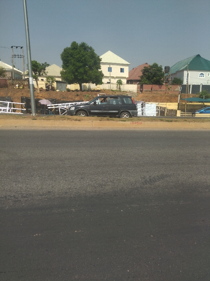 black SUV parked on the side of a paved road, facing forward. The SUV is parked on the edge of the road, close to a curb. There are multiple sets of metal scaffolding, including ladders, on the side of the road near the SUV, and there are some people in the background. The road is empty, and the sky is clear. The image was taken in Abuja, Nigeria, at coordinates 8.913, 7.564. There are multiple buildings in the background, including a two-story house with a green roof.
