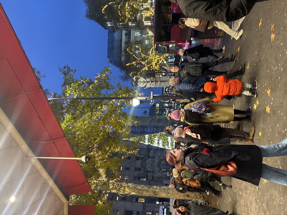 A nighttime street scene shows a crowd of people on a sidewalk decorated with autumn leaves. A large Christmas tree is visible amidst the crowd. Trees are decorated with twinkling lights. Buildings rise behind the crowd. A red awning is in the foreground. A blue sky is above the buildings and trees. Some people are standing near a red bus, while others are looking towards the decorated tree.