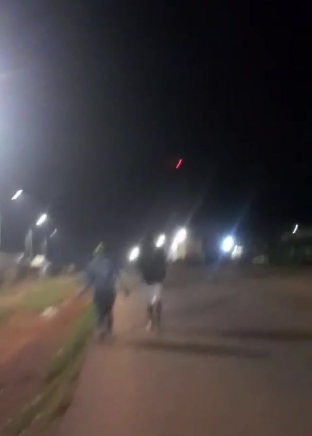 Two people are walking on a paved path on a dark night. The camera follows them from behind. There are streetlights lining the path. There is a grassy area and a dirt road to the left. Some buildings are visible in the background. A red light can be seen far in the distance.