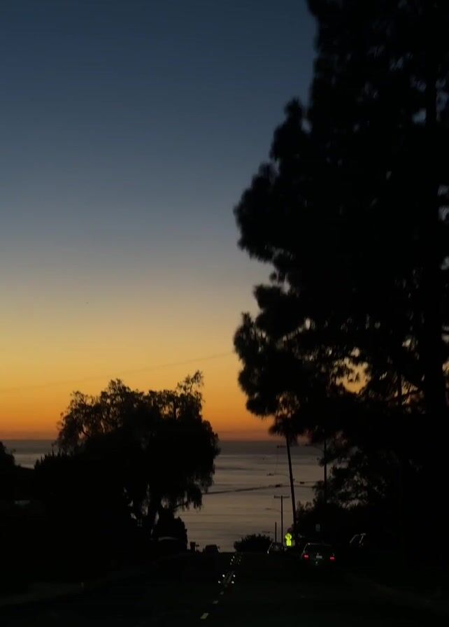 view of a road leading downhill towards the ocean at sunset. The sky is a gradient of blue at the top, transitioning to orange near the horizon. Silhouetted trees frame the road on both sides. Cars are parked along the road and at least one is driving. Yellow lines mark the lanes. Utility poles are visible, and a street light is illuminated. The ocean horizon is a bright orange.